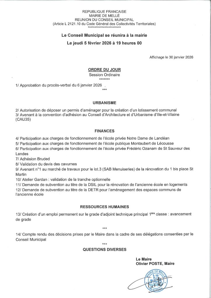 Conseil municipal du jeudi 5 février à 19h en mairie : ordre du jour