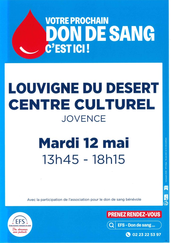 La prochaine collecte de sang aura lieu le mardi 12 mai au centre culturel de Jovence…